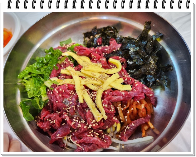 주문과 동시에 비빔밥이 순식간에 나옵니다. 눈으로만 봐도 신선한 고기가 올려져 있어 너무나도 먹고 싶어 지는 그림이었습니다. 여기에 고추장을 넣어 조금씩 조금씩 비비다 보면 맛있게 보이는 비빔밥이 완성이 됩니다.